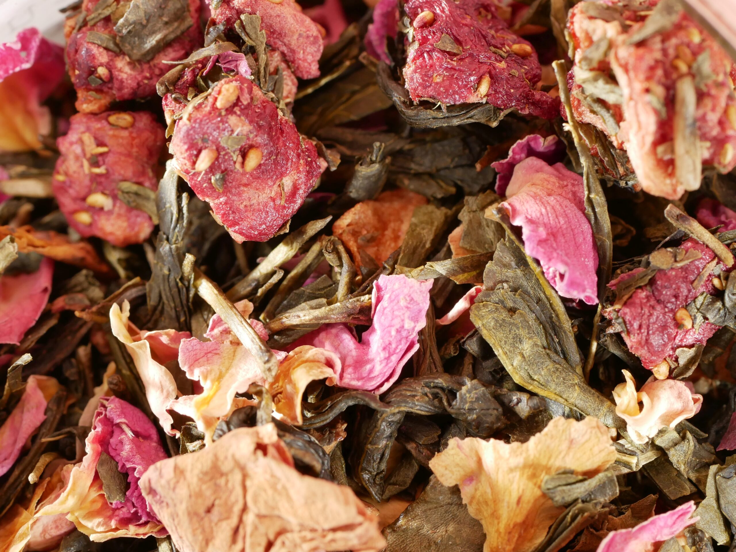 Groene thee met stukjes aardbei en blaadjes van roos. Bloemig, zoetjes en fris. Ook voor ijsthee.